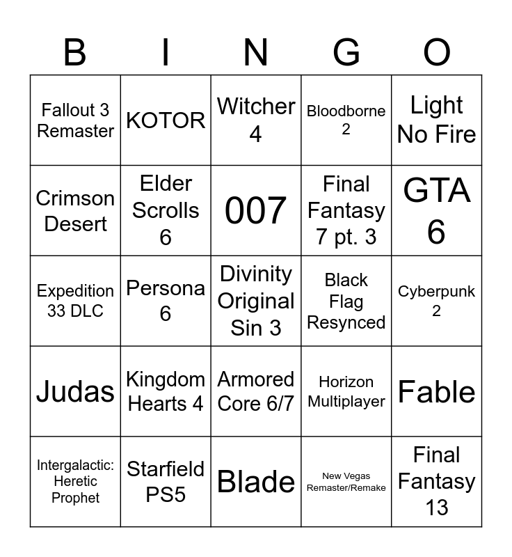 This bingo card has a free space and 24 words: Intergalactic: Heretic Prophet, Kingdom Hearts 4, 007, New Vegas Remaster/Remake, Light No Fire, Fallout 3 Remaster, KOTOR, Witcher 4, Black Flag Resynced, Cyberpunk 2, Expedition 33 DLC, Elder Scrolls 6, Horizon Multiplayer, Fable, Crimson Desert, Starfield PS5, Blade, Bloodborne 2, GTA 6, Judas, Persona 6, Armored Core 6/7, Final Fantasy 7 pt. 3 and Final Fantasy 13.