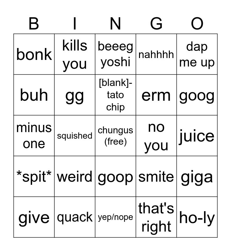 This bingo card has a free space and 24 words: weird, quack, [blank]-tato chip, give, dap me up, bonk, buh, kills you, no you, goop, erm, minus one, smite, giga, gg, that's right, juice, beeeg yoshi, goog, squished, ho-ly, *spit*, nahhhh and yep/nope.