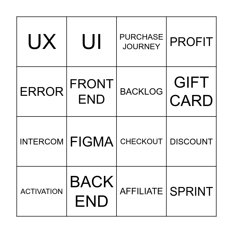This bingo card has 16 words: BACK END, DISCOUNT, PURCHASE JOURNEY, UX, INTERCOM, UI, CHECKOUT, AFFILIATE, ERROR, FRONT END, ACTIVATION, PROFIT, FIGMA, GIFT CARD, BACKLOG and SPRINT.