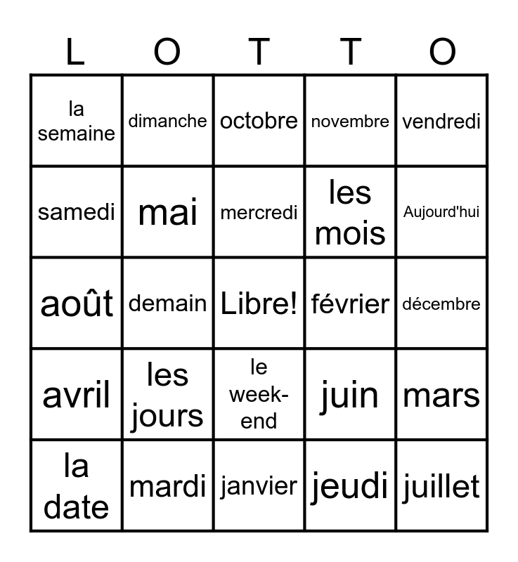 This bingo card has a free space and 27 words: lundi, mardi, mercredi, jeudi, vendredi, samedi, dimanche, janvier, février, mars, avril, mai, juin, juillet, août, septembre, octobre, novembre, décembre, la semaine, les jours, le week-end, les mois, Aujourd'hui, la date, demain and Mon anniversaire.