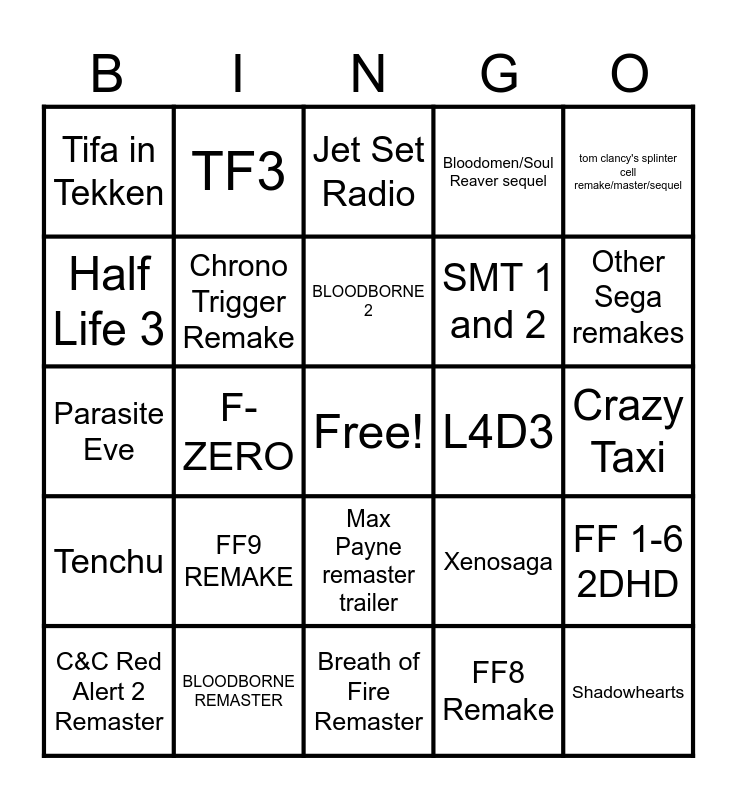 This bingo card has a free space and 24 words: FF9 REMAKE, BLOODBORNE REMASTER, BLOODBORNE 2, C&C Red Alert 2 Remaster, tom clancy's splinter cell remake/master/sequel, Tifa in Tekken, Half Life 3, TF3, L4D3, Max Payne remaster trailer, SMT 1 and 2, Parasite Eve, Xenosaga, FF 1-6 2DHD, Chrono Trigger Remake, FF8 Remake, Crazy Taxi, Jet Set Radio, Other Sega remakes, F-ZERO, Shadowhearts, Tenchu, Bloodomen/Soul Reaver sequel and Breath of Fire Remaster.