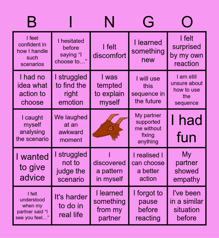 This bingo card has a free space and 32 words: I forgot to pause before reacting, I named an emotion, We laughed at an awkward moment, I usually skip the breathing step in real life, I wanted to give advice, I struggled to find the right emotion, I felt surprised by my own reaction, My partner showed empathy, I hesitated before saying “I choose to…”, I recognised an emotion I avoid, I was tempted to explain myself, I felt discomfort, I reacted differently than I expected, I felt more calm after the “breathe” step, My partner supported me without fixing anything, I realised how tricky it is to only respond to emotion, I felt understood when my partner said “I see you feel…”, I caught myself analysing the scenario, I discovered a pattern in myself, I struggled not to judge the scenario, I realised I can choose a better action, I felt more confident about using the Dragon Taming Sequence, I had fun, It's harder to do in real life, I've been in a similar situation before, I learned something new, I will use this sequence in the future, I had no idea what action to choose, I feel confident in how I handle such scenarios, I learned something from my partner, I need more practice and I am still unsure about how to use the sequence.
