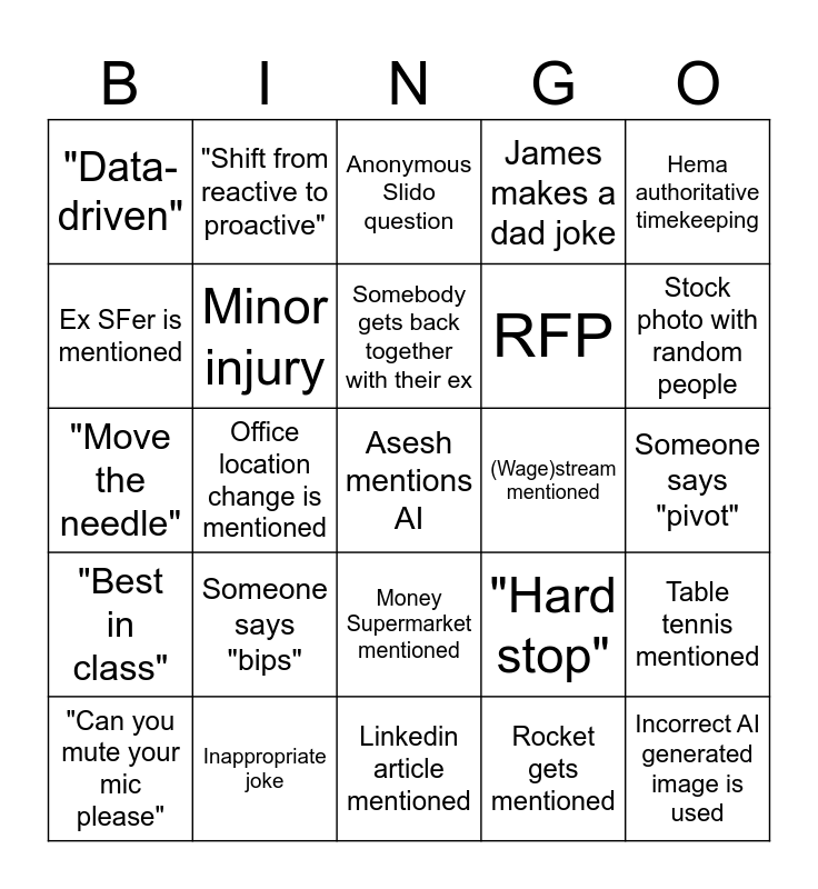 This bingo card has 43 words: Free!, Asesh mentions AI, EBITDA, "Can you mute your mic please", Tunnel gets mentioned, Rocket gets mentioned, Anonymous Slido question, Technical issues, Hema authoritative timekeeping, Inappropriate joke, James makes a dad joke, (Wage)stream mentioned, Money Supermarket mentioned, Someone says "bips", Trustpilot review on screen, Linkedin article mentioned, "Low-hanging fruit", "Move the needle", Slide with more than 5 bullet points, Stock photo with random people, "Shift from reactive to proactive", "North Star", "Think outside the box / blue sky thinking", "Data-driven", Bird mentioned (not Blue Jay), Someone says "pivot", Someone says "win-win", FinFit gets mentioned, "Hard stop", "Best in class", "Lots of moving parts", Table tennis mentioned, "Let's take a step back", Office location change is mentioned, Asesh wears RL, Someone leaves the room mid presentation, Incorrect AI generated image is used, Somebody gets back together with their ex, Ex SFer is mentioned, RFP, Tillo mentioned, Minor injury and Major injury.