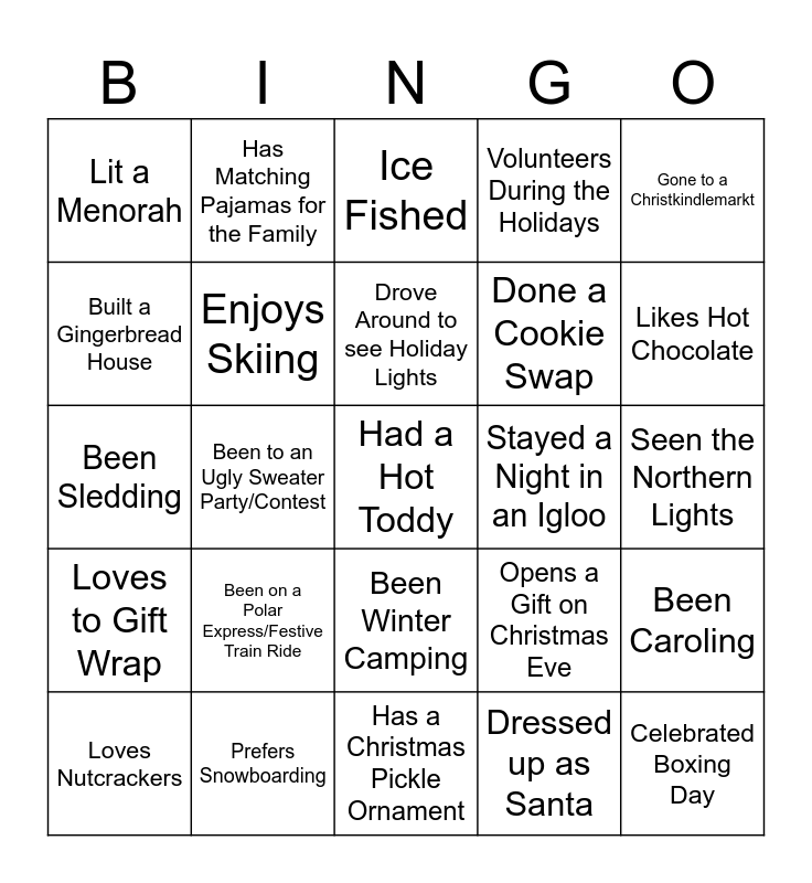 This bingo card has 40 words: Been Ice Skating, Been Sledding, Been Winter hiking, Enjoys Skiing, Prefers Snowboarding, Been Winter Camping, Drove Around to see Holiday Lights, Watched Elf, Gone to a Christkindlemarkt, Loves to Gift Wrap, Been to an Ugly Sweater Party/Contest, Volunteers During the Holidays, Had a Hot Toddy, Seen the Northern Lights, Stayed a Night in an Igloo, Been on a Polar Express/Festive Train Ride, Played Dreidel, Lit a Menorah, Been Snow Tubing, Ice Fished, Been Caroling, Dressed up as Santa, Done a Cookie Swap, Built a Gingerbread House, Can Quote a Line from a Christmas Movie, Thinks Die Hard is a Christmas Movie, Done Elf on a Shelf, Has an Advent Calendar this Year, Celebrated Boxing Day, Participated in a Secret Santa Gift Exchange, Participated in a Dirty Santa Gift Exchange, Loves Nutcrackers, Has Holiday Inflatables on their Lawn, Opens a Gift on Christmas Eve, Likes Hot Chocolate, Has a Christmas Pickle Ornament, Has Antlers or Other Decoration on their Car, Has had Fried Chicken for Christmas, Has Matching Pajamas for the Family and Has a Fireplace in their House.
