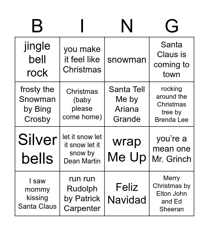 This bingo card has 36 words: Free!, all I want for Christmas is you by Mariah Carey, mistletoe by Justin Bieber, Santa Tell Me by Ariana Grande, last Christmas by Wham!, Merry Christmas by Elton John and Ed Sheeran, rocking around the Christmas tree by Brenda Lee, it’s beginning to look a lot like Christmas by Michael Bublé, frosty the Snowman by Bing Crosby, Rudolph, the rednosed reindeer by Gene Autry, you’re a mean one Mr. Grinch, Santa Claus is coming to town, baby, it’s cold outside by Shawn Ryan, run run Rudolph by Patrick Carpenter, let it snow let it snow let it snow by Dean Martin, jingle bell rock, underneath the tree, Merry Christmas happy holidays, I saw mommy kissing Santa Claus, snowman, Feliz Navidad, do they know it’s Christmas?, Holly Jolly Christmas, we wish you a merry Christmas, like It’s Christmas, you make it feel like Christmas, wrap Me Up, Candy Cane Lane, Silver bells, Christmas (baby please come home), I want a hippopotamus for Christmas, Santa Baby, 12 Days Of Christmas, my only wish, Blue Christmas and deck the halls.
