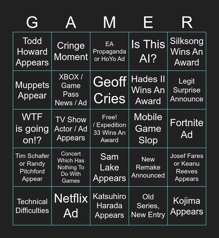 This bingo card has a free space and 24 words: Concert Which Has Nothing To Do With Games, Netflix Ad, Geoff Cries, Technical Difficulties, Silksong Wins An Award, Todd Howard Appears, Muppets Appear, Cringe Moment, Mobile Game Slop, Sam Lake Appears, Hades II Wins An Award, WTF is going on!?, New Remake Announced, Josef Fares or Keanu Reeves Appears, XBOX / Game Pass News / Ad, Old Series, New Entry, Fortnite Ad, EA Propaganda or HoYo Ad, Legit Surprise Announce, TV Show Actor / Ad Appears, Kojima Appears, Tim Schafer or Randy Pitchford Appear, Is This AI? and Katsuhiro Harada Appears.
