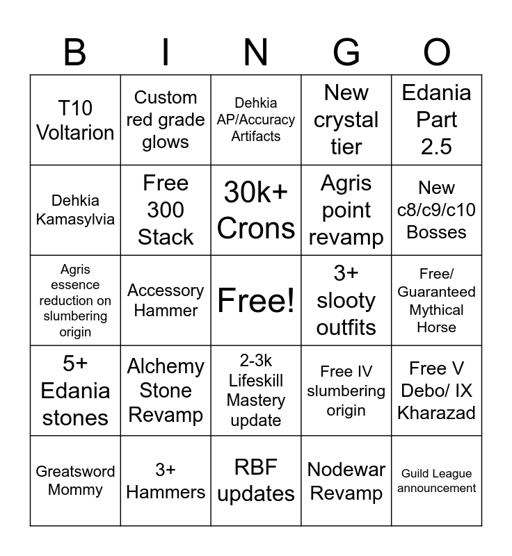 This bingo card has a free space and 24 words: Alchemy Stone Revamp, 3+ Hammers, 30k+ Crons, Greatsword Mommy, Edania Part 2.5, T10 Voltarion, Dehkia Kamasylvia, Custom red grade glows, 3+ slooty outfits, 2-3k Lifeskill Mastery update, Agris point revamp, Agris essence reduction on slumbering origin, Free IV slumbering origin, Free V Debo/ IX Kharazad, Free 300 Stack, Nodewar Revamp, Free/ Guaranteed Mythical Horse, Dehkia AP/Accuracy Artifacts, New c8/c9/c10 Bosses, Accessory Hammer, Guild League announcement, 5+ Edania stones, New crystal tier and RBF updates.