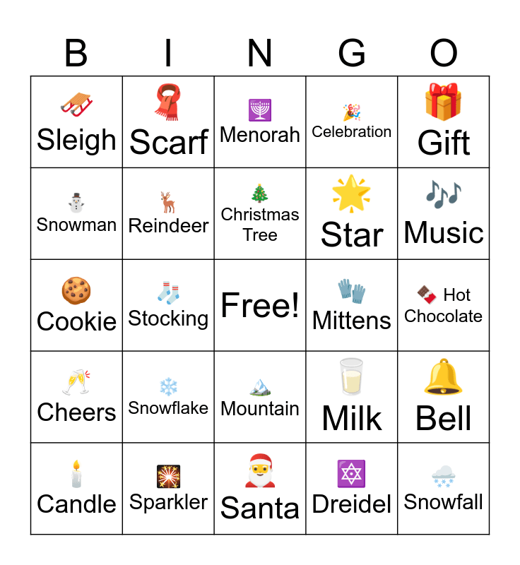 This bingo card has a free space and 25 words: โ๏ธ Snowflake, ๐ Santa, ๐ Christmas Tree, ๐ฏ Candle, ๐ Gift, ๐ท Sleigh, โ Snowman, ๐งฃ Scarf, ๐งค Mittens, ๐ Mountain, ๐ Star, ๐ช Cookie, ๐ฅ Milk, ๐ Bell, ๐ฆ Reindeer, ๐ Cozy Home, ๐ซ Hot Chocolate, ๐ Menorah, ๐ถ Music, ๐งฆ Stocking, ๐จ Snowfall, ๐ Sparkler, ๐ฅ Cheers, ๐ Celebration and ๐ฏ Dreidel.