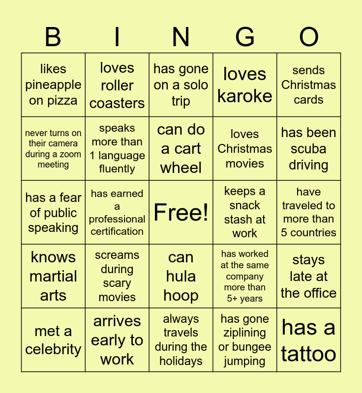 This bingo card has a free space and 24 words: met a celebrity, screams during scary movies, can do a cart wheel, has gone ziplining or bungee jumping, sends Christmas cards, likes pineapple on pizza, loves roller coasters, has gone on a solo trip, keeps a snack stash at work, have traveled to more than 5 countries, has a fear of public speaking, speaks more than 1 language fluently, has worked at the same company more than 5+ years, stays late at the office, never turns on their camera during a zoom meeting, arrives early to work, always travels during the holidays, loves karoke, has been scuba driving, knows martial arts, has earned a professional certification, can hula hoop, loves Christmas movies and has a tattoo.
