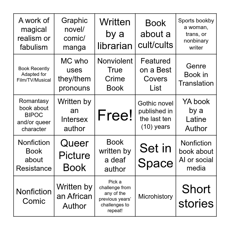This bingo card has a free space and 24 words: Queer Picture Book, Written by an African Author, Nonviolent True Crime Book, Nonfiction Comic, Sports bookby a woman, trans, or nonbinary writer, A work of magical realism or fabulism, Book Recently Adapted for Film/TV/Musical, Graphic novel/ comic/ manga, Gothic novel published in the last ten (10) years, Book written by a deaf author, Featured on a Best Covers List, Romantasy book about BIPOC and/or queer character, Set in Space, Nonfiction book about AI or social media, MC who uses they/them pronouns, Microhistory, YA book by a Latine Author, Written by a librarian, Genre Book in Translation, Written by an Intersex author, Short stories, Nonfiction Book about Resistance, Book about a cult/cults and Pick a challenge from any of the previous years’ challenges to repeat!.