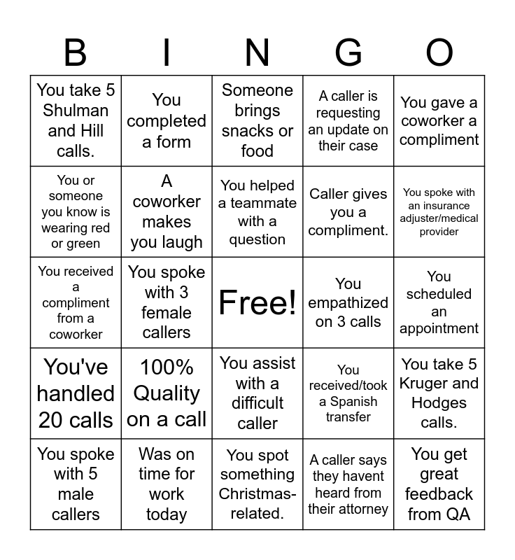 This bingo card has a free space and 24 words: 100% Quality on a call, Was on time for work today, You helped a teammate with a question, You spoke with 5 male callers, You gave a coworker a compliment, You take 5 Shulman and Hill calls., You or someone you know is wearing red or green, You completed a form, You empathized on 3 calls, You assist with a difficult caller, Caller gives you a compliment., You received a compliment from a coworker, You received/took a Spanish transfer, You take 5 Kruger and Hodges calls., A coworker makes you laugh, A caller says they havent heard from their attorney, You scheduled an appointment, Someone brings snacks or food, You spoke with an insurance adjuster/medical provider, You spoke with 3 female callers, You get great feedback from QA, You've handled 20 calls, A caller is requesting an update on their case and You spot something Christmas-related..