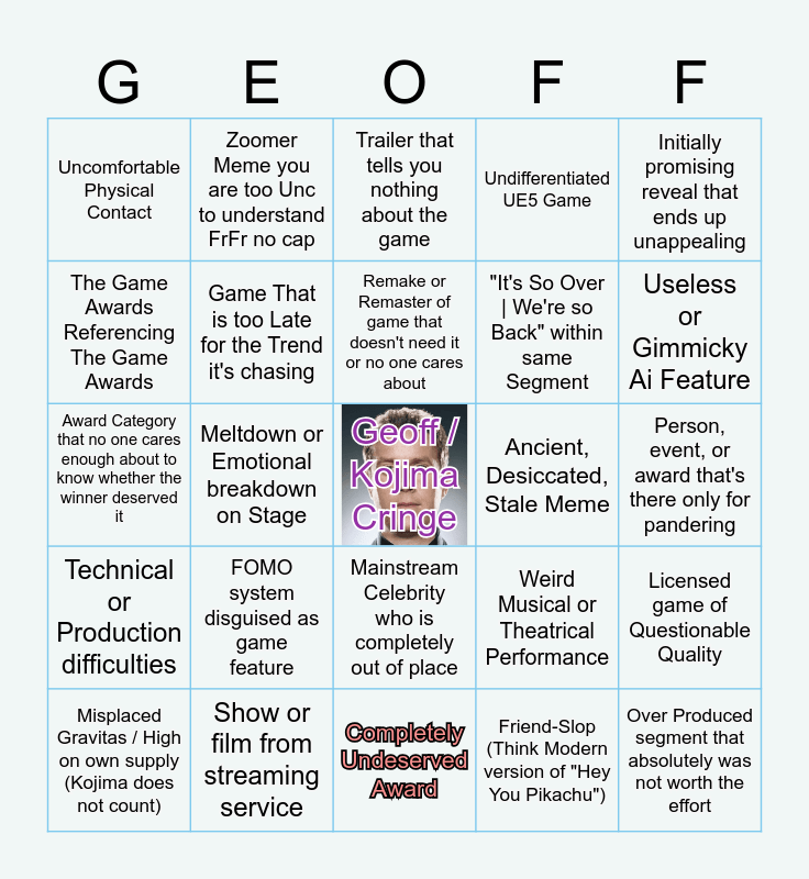 This bingo card has a free space and 24 words: FOMO system disguised as game feature, Show or film from streaming service, Remake or Remaster of game that doesn't need it or no one cares about, Misplaced Gravitas / High on own supply (Kojima does not count), Initially promising reveal that ends up unappealing, Uncomfortable Physical Contact, The Game Awards Referencing The Game Awards, Zoomer Meme you are too Unc to understand FrFr no cap, Ancient, Desiccated, Stale Meme, Mainstream Celebrity who is completely out of place, "It's So Over | We're so Back" within same Segment, Award Category that no one cares enough about to know whether the winner deserved it, Weird Musical or Theatrical Performance, Licensed game of Questionable Quality, Game That is too Late for the Trend it's chasing, Friend-Slop (Think Modern version of "Hey You Pikachu"), Person, event, or award that's there only for pandering, Trailer that tells you nothing about the game, Useless or Gimmicky Ai Feature, Meltdown or Emotional breakdown on Stage, Over Produced segment that absolutely was not worth the effort, Technical or Production difficulties, Undifferentiated UE5 Game and Completely Undeserved Award.