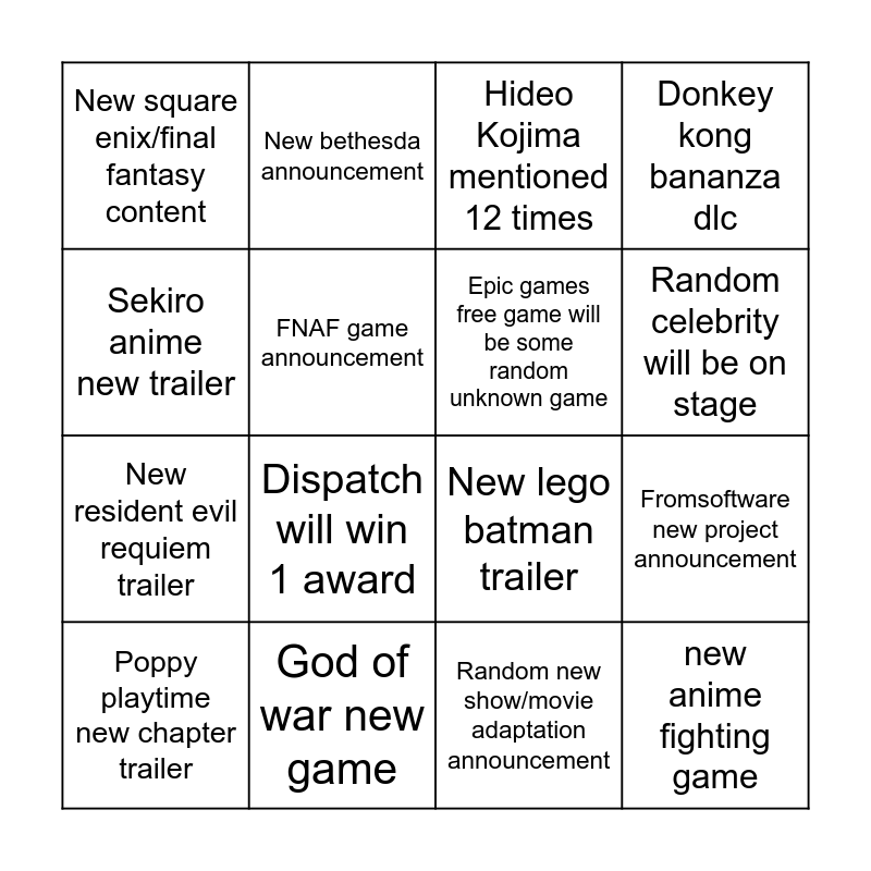 This bingo card has 16 words: God of war new game, Fromsoftware new project announcement, Hideo Kojima mentioned 12 times, New square enix/final fantasy content, New resident evil requiem trailer, New bethesda announcement, New lego batman trailer, Random new show/movie adaptation announcement, Sekiro anime new trailer, FNAF game announcement, Poppy playtime new chapter trailer, Donkey kong bananza dlc, Dispatch will win 1 award, Random celebrity will be on stage, Epic games free game will be some random unknown game and new anime fighting game.