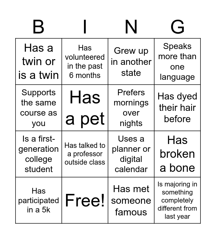 This bingo card has 27 words: Has traveled to another country, Is the oldest sibling, Is a first-generation college student, Has moved more than 3 times, Has a pet, Grew up in another state, Has volunteered in the past 6 months, Is majoring in something completely different from last year, Free!, Has changed their major at least once, Uses a planner or digital calendar, Speaks more than one language, Wants to study abroad, Has taken an online-only class, Has talked to a professor outside class, Can whistle loudly, Prefers mornings over nights, Has dyed their hair before, Can play a musical instrument, Has a twin or is a twin, Has met someone famous, Has been to a concert in the past year, Has broken a bone, Has participated in a 5k, Has the same birthday month as you, Supports the same course as you and Had the same top artist last year on their wrapped.