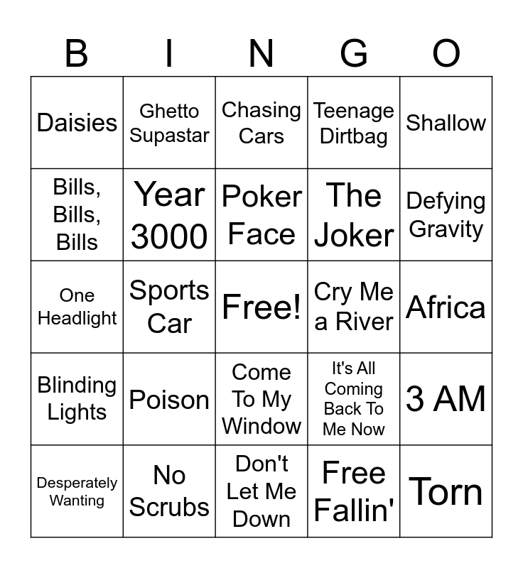 This bingo card has a free space and 37 words: Walking On Broken Glass, We Can't Stop, What's Up?, Year 3000, 3 AM, Poison, Poker Face, Rockstar, Shallow, The Sign, Sports Car, Teenage Dirtbag, Torn, Africa, Bills, Bills, Bills, Blinding Lights, Brown Eyed Girl, Chasing Cars, Come To My Window, Cry Me a River, Daisies, Defying Gravity, Desperately Wanting, Don't Let Me Down, Drop It Like It's Hot, Free Fallin', Ghetto Supastar, Higher Love, More Than a Feeling, Ms Jackson, Night Moves, No Scrubs, One Headlight, If You Could Only See, It's All Coming Back To Me Now, The Joker and Milkshake.