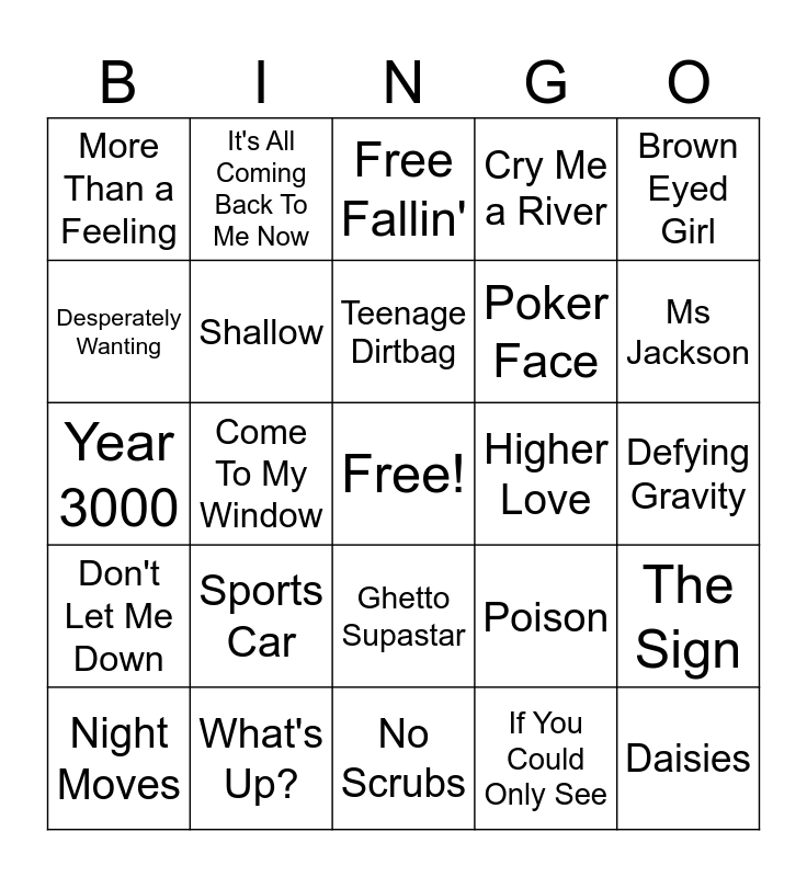 This bingo card has a free space and 37 words: Torn, Africa, Bills, Bills, Bills, Shallow, The Sign, Sports Car, Teenage Dirtbag, Blinding Lights, Brown Eyed Girl, Chasing Cars, Come To My Window, Cry Me a River, Daisies, Defying Gravity, Desperately Wanting, Don't Let Me Down, Drop It Like It's Hot, Free Fallin', Ghetto Supastar, Higher Love, More Than a Feeling, Ms Jackson, Night Moves, No Scrubs, One Headlight, If You Could Only See, It's All Coming Back To Me Now, The Joker, Milkshake, Walking On Broken Glass, We Can't Stop, What's Up?, Year 3000, 3 AM, Poison, Poker Face and Rockstar.