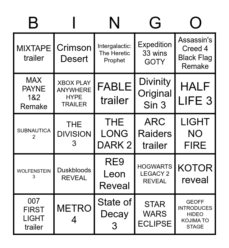 This bingo card has a free space and 24 words: Duskbloods REVEAL, METRO 4, FABLE trailer, 007 FIRST LIGHT trailer, Assassin's Creed 4 Black Flag Remake, MIXTAPE trailer, MAX PAYNE 1&2 Remake, Crimson Desert, ARC Raiders trailer, RE9 Leon Reveal, Divinity Original Sin 3, SUBNAUTICA 2, HOGWARTS LEGACY 2 REVEAL, KOTOR reveal, XBOX PLAY ANYWHERE HYPE TRAILER, STAR WARS ECLIPSE, LIGHT NO FIRE, Intergalactic: The Heretic Prophet, HALF LIFE 3, THE DIVISION 3, GEOFF INTRODUCES HIDEO KOJIMA TO STAGE, WOLFENSTEIN 3, Expedition 33 wins GOTY and State of Decay 3.