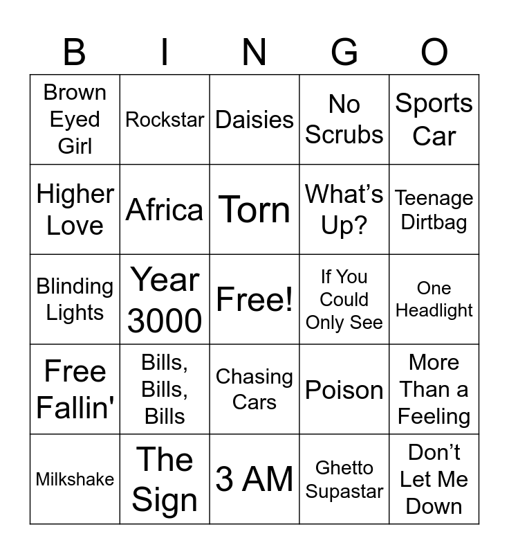 This bingo card has a free space and 35 words: The Joker, We Can’t Stop, Desperately Wanting, Africa, Chasing Cars, No Scrubs, Higher Love, Drop It Like It's Hot, Torn, Ms Jackson, Blinding Lights, Sports Car, Come To My Window, Poker Face, Brown Eyed Girl, If You Could Only See, Ghetto Supastar, Year 3000, Free Fallin', Don’t Let Me Down, Poison, Milkshake, More Than a Feeling, The Sign, Daisies, Teenage Dirtbag, Cry Me a River, Shallow, What’s Up?, One Headlight, Walking On Broken Glass, 3 AM, Bills, Bills, Bills, Rockstar and It’s All Coming Back To Me Now.