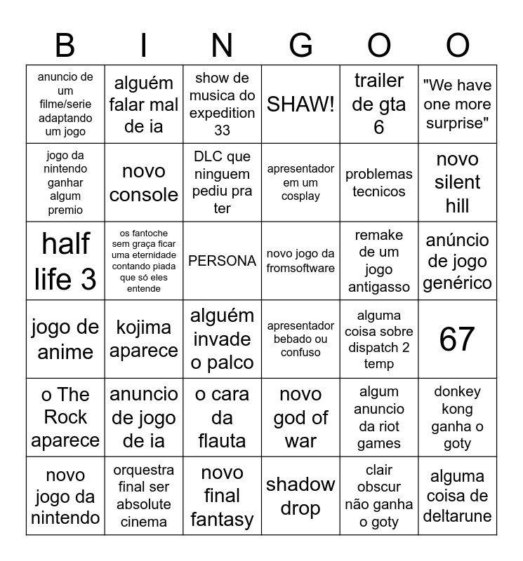 This bingo card has 36 words: jogo de anime, kojima aparece, novo final fantasy, apresentador em um cosplay, remake de um jogo antigasso, anúncio de jogo genérico, anuncio de um filme/serie adaptando um jogo, orquestra final ser absolute cinema, show de musica do expedition 33, novo god of war, problemas tecnicos, "We have one more surprise", o The Rock aparece, os fantoche sem graça ficar uma eternidade contando piada que só eles entende, DLC que ninguem pediu pra ter, SHAW!, algum anuncio da riot games, 67, jogo da nintendo ganhar algum premio, novo console, alguém invade o palco, apresentador bebado ou confuso, alguma coisa sobre dispatch 2 temp, donkey kong ganha o goty, half life 3, alguém falar mal de ia, PERSONA, shadow drop, trailer de gta 6, novo silent hill, novo jogo da nintendo, anuncio de jogo de ia, o cara da flauta, novo jogo da fromsoftware, clair obscur não ganha o goty and alguma coisa de deltarune.