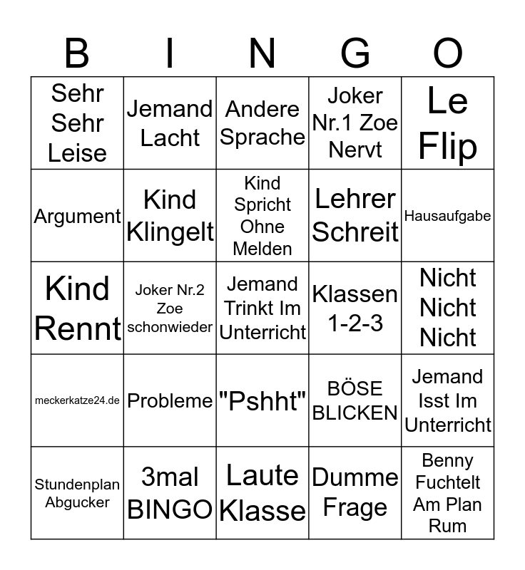 This bingo card has 25 words: Probleme, Laute Klasse, Kind Spricht Ohne Melden, Stundenplan Abgucker, Le Flip, Sehr Sehr Leise, Argument, Jemand Lacht, Klassen 1-2-3, "Pshht", Lehrer Schreit, Kind Rennt, BÖSE BLICKEN, Jemand Isst Im Unterricht, Kind Klingelt, Benny Fuchtelt Am Plan Rum, Nicht Nicht Nicht, Andere Sprache, Hausaufgabe, Joker Nr.2 Zoe schonwieder, Jemand Trinkt Im Unterricht, 3mal BINGO, meckerkatze24.de, Joker Nr.1 Zoe Nervt and Dumme Frage.
