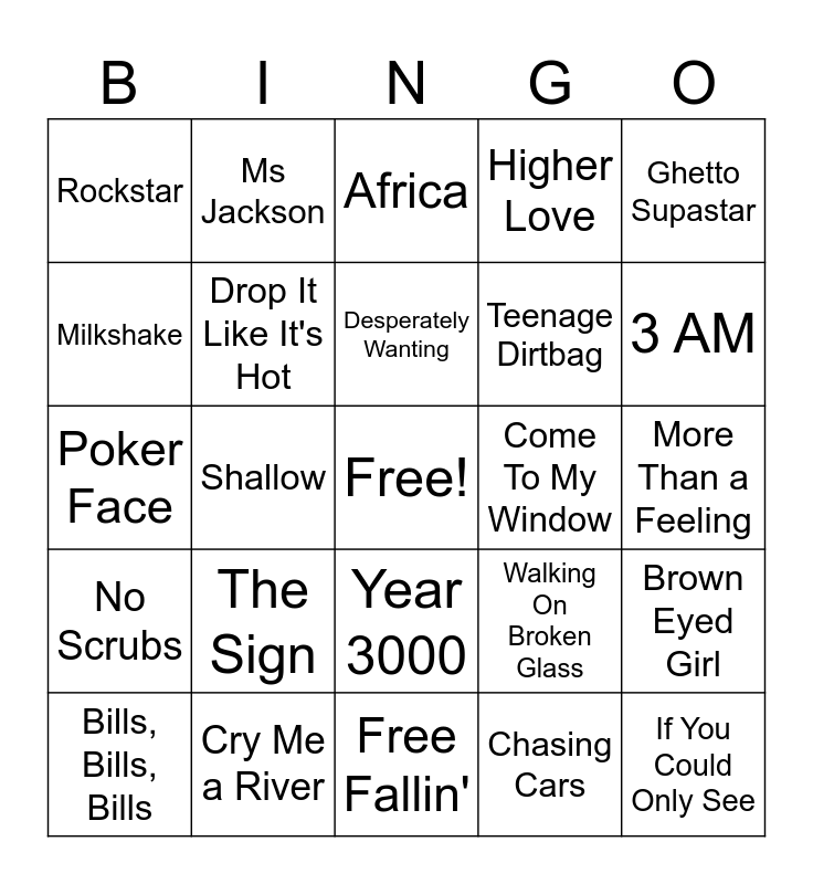 This bingo card has a free space and 35 words: The Joker, Daisies, One Headlight, Drop It Like It's Hot, Year 3000, Higher Love, Milkshake, Blinding Lights, Desperately Wanting, Torn, Poker Face, Ghetto Supastar, What’s Up?, Sports Car, Rockstar, Come To My Window, Chasing Cars, Shallow, No Scrubs, If You Could Only See, Walking On Broken Glass, Bills, Bills, Bills, Brown Eyed Girl, Cry Me a River, Africa, 3 AM, We Can’t Stop, Poison, Teenage Dirtbag, More Than a Feeling, Don’t Let Me Down, Free Fallin', The Sign, Ms Jackson and It’s All Coming Back To Me Now.