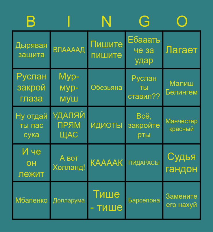 This bingo card has a free space and 24 words: А вот Холланд!, Долларума, Обезьяна, Мбапенко, Лагает, Дырявая защита, Руслан закрой глаза, ВЛААААД, Всё, закройте рты, КААААК, Руслан ты ставил??, Ну отдай ты пас сука, ПИДАРАСЫ, Судья гандон, Мур-мур-муш, Барселона, Манчестер красный, Пишите пишите, Малиш Белингем, УДАЛЯЙ ПРЯМ ЩАС, Замените его нахуй, И че он лежит, Ебааать че за удар and Тише - тише.