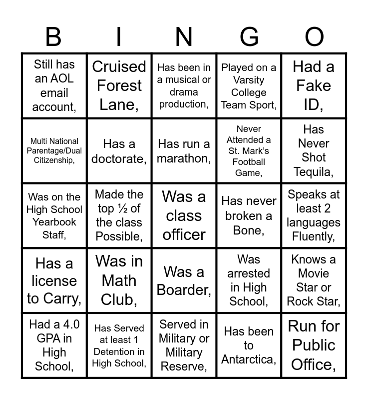 This bingo card has a free space and 34 words: Has Bungee Jumped off a Bridge,, Has been to Antarctica,, Has been on an Indy Car Team,, Has Been on an African Safari,, Has a license to Carry,, Has a doctorate,, Had a Fake ID,, Had a 4.0 GPA in High School,, Cruised Forest Lane,, Captain of a Varsity Sports Team in High School,, Has run a marathon,, Has been in a musical or drama production,, Has had more than 5 pets at one time,, Has never Been in a Car Accident,, Has never broken a Bone,, Has Never Shot Tequila,, Has Served at least 1 Detention in High School,, Was on the High School Yearbook Staff,, Was in Math Club,, Was arrested in High School,, Was a Boarder,, Studied Abroad,, Still has an AOL email account,, Speaks at least 2 languages Fluently,, Served in Military or Military Reserve,, Run for Public Office,, Played on a Varsity College Team Sport,, Participated in the Baja 500,, Never Attended a St. Mark’s Football Game,, Multi National Parentage/Dual Citizenship,, Moved Back Home after College,, Made the top ½ of the class Possible,, Knows a Movie Star or Rock Star, and Is within 15lbs of High School Graduation Weight.