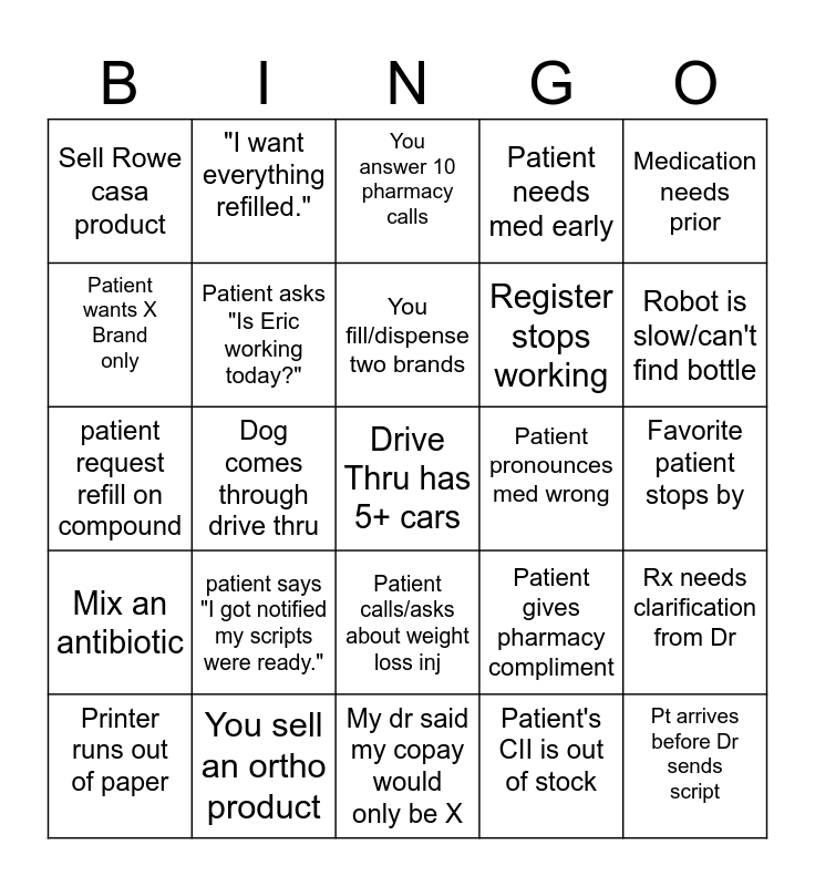 This bingo card has a free space and 24 words: patient says "I got notified my scripts were ready.", You sell an ortho product, You fill/dispense two brands, Printer runs out of paper, Medication needs prior, Sell Rowe casa product, Patient wants X Brand only, "I want everything refilled.", Patient pronounces med wrong, Patient calls/asks about weight loss inj, Register stops working, patient request refill on compound, Patient gives pharmacy compliment, Rx needs clarification from Dr, Patient asks "Is Eric working today?", Patient's CII is out of stock, Favorite patient stops by, You answer 10 pharmacy calls, Robot is slow/can't find bottle, Dog comes through drive thru, Pt arrives before Dr sends script, Mix an antibiotic, Patient needs med early and My dr said my copay would only be X.