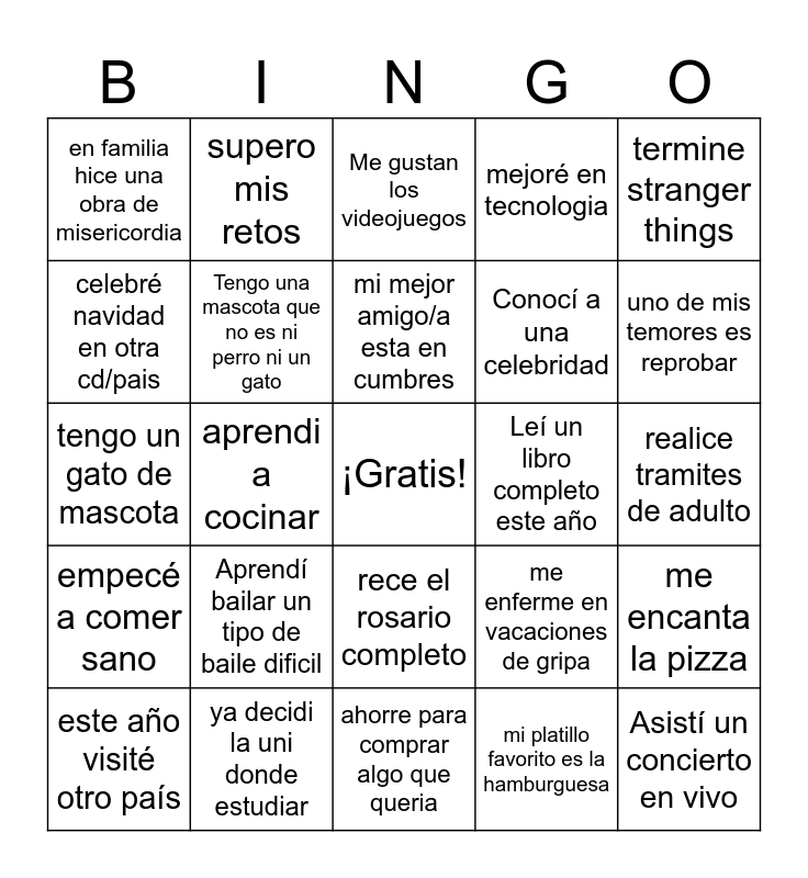 This bingo card has a free space and 29 words: este año visité otro país, en fin comí comida callejera y me enfermé, aprendi a cocinar, toco un instrumento musical que no es guitarra, en familia hice una obra de misericordia, Me gustan los videojuegos, Tengo una mascota que no es ni perro ni un gato, Aprendí bailar un tipo de baile dificil, Leí un libro completo este año, ya decidi la uni donde estudiar, realice tramites de adulto, Asistí un concierto en vivo, ahorre para comprar algo que queria, mi platillo favorito es la hamburguesa, uno de mis temores es reprobar, Falté clase, rece el rosario completo, empecé a comer sano, termine stranger things, tengo un gato de mascota, me enferme en vacaciones de gripa, voy a participar en un concurso escolar, Conocí a una celebridad, celebré navidad en otra cd/pais, mejoré en tecnologia, supero mis retos, me encanta la pizza, mi mejor amigo/a esta en cumbres and soy muy feliz.