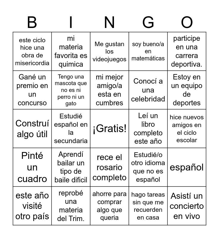 This bingo card has a free space and 29 words: este año visité otro país, en fin comí comida callejera y me enfermé, Estudié español en la secundaria, Toco un instrumento musical, este ciclo hice una obra de misericordia, Me gustan los videojuegos, Tengo una mascota que no es ni perro ni un gato, Aprendí bailar un tipo de baile dificil, Leí un libro completo este año, reprobé una materia del Trim., hice nuevos amigos en el ciclo escolar, Asistí un concierto en vivo, ahorre para comprar algo que queria, hago tareas sin que me recuerden en casa, Estoy en un equipo de deportes, Falté clase, rece el rosario completo, Pinté un cuadro, participe en una carrera deportiva., Construí algo útil, Estudié/o otro idioma que no es español, voy a participar en un concurso escolar, Conocí a una celebridad, Gané un premio en un concurso, soy bueno/a en matemáticas, mi materia favorita es quimica, español, mi mejor amigo/a esta en cumbres and soy muy feliz.