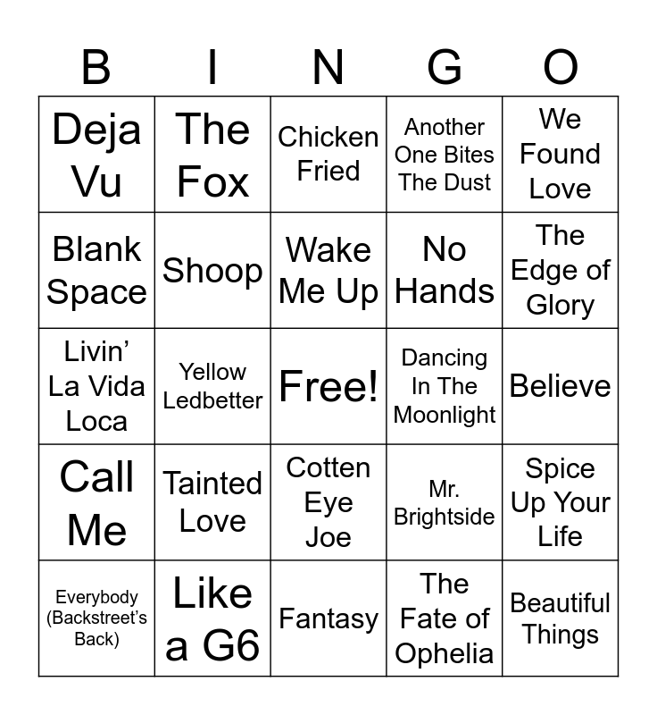 This bingo card has a free space and 37 words: Pink Pony Club, The Real Slim Shady, Running Up That Hill, Shoop, Spice Up Your Life, Tainted Love, Wake Me Up, Waterfalls, We Found Love, Whatta Man, Yellow Ledbetter, Another One Bites The Dust, Beautiful Things, Believe, Blank Space, Call Me, Call Me Maybe, Chicken Fried, Cotten Eye Joe, Dancing In The Moonlight, Deja Vu, The Edge of Glory, Everybody (Backstreet’s Back), Fantasy, Fast Car, The Fate of Ophelia, The Fox, Hold On, I Love It, It’s Gonna Be Me, Kiss Me, Like a G6, Livin’ La Vida Loca, Low, Mr. Brightside, No Hands and Oops! I Did It Again.