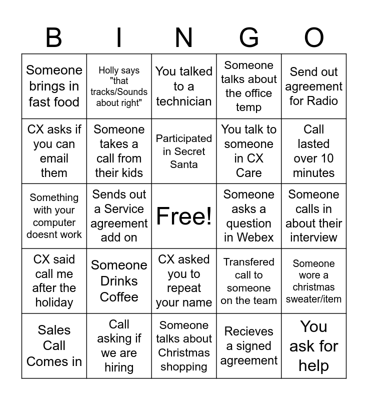 This bingo card has a free space and 24 words: Someone Drinks Coffee, Call asking if we are hiring, Participated in Secret Santa, Sales Call Comes in, Send out agreement for Radio, Someone brings in fast food, CX asks if you can email them, Holly says "that tracks/Sounds about right", Someone asks a question in Webex, CX asked you to repeat your name, You talk to someone in CX Care, Something with your computer doesnt work, Transfered call to someone on the team, Someone wore a christmas sweater/item, Someone takes a call from their kids, Recieves a signed agreement, Someone calls in about their interview, You talked to a technician, Call lasted over 10 minutes, Sends out a Service agreement add on, You ask for help, CX said call me after the holiday, Someone talks about the office temp and Someone talks about Christmas shopping.