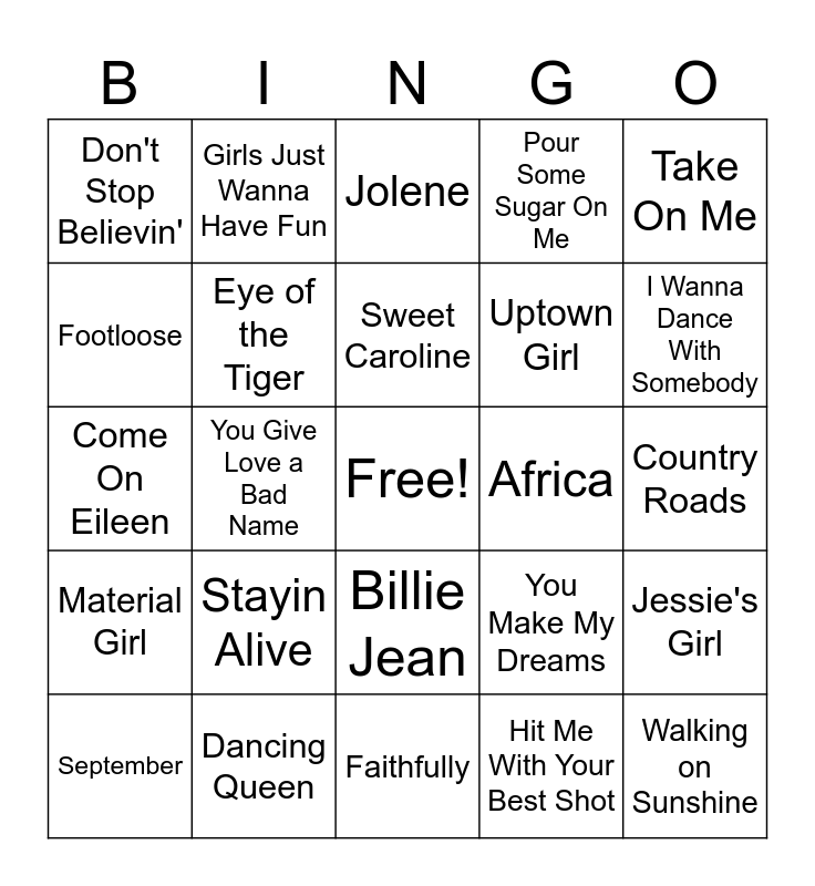 This bingo card has a free space and 24 words: Stayin Alive, Dancing Queen, Sweet Caroline, September, Take On Me, Don't Stop Believin', Footloose, Girls Just Wanna Have Fun, Africa, Billie Jean, Uptown Girl, Come On Eileen, You Make My Dreams, Jessie's Girl, Eye of the Tiger, Hit Me With Your Best Shot, Country Roads, Jolene, I Wanna Dance With Somebody, You Give Love a Bad Name, Walking on Sunshine, Material Girl, Pour Some Sugar On Me and Faithfully.