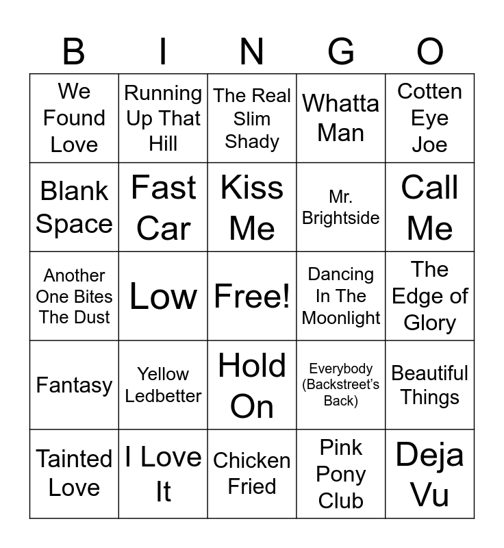 This bingo card has a free space and 35 words: Believe, Wake Me Up, The Fox, Fast Car, Hold On, Whatta Man, Blank Space, No Hands, Kiss Me, Spice Up Your Life, Another One Bites The Dust, Cotten Eye Joe, The Fate of Ophelia, Call Me Maybe, We Found Love, Dancing In The Moonlight, Pink Pony Club, Low, Fantasy, Deja Vu, Everybody (Backstreet’s Back), Tainted Love, Beautiful Things, I Love It, The Real Slim Shady, Call Me, Oops! I Did It Again, Waterfalls, Mr. Brightside, The Edge of Glory, Like a G6, Chicken Fried, Yellow Ledbetter, Running Up That Hill and Livin’ La Vida Loca.