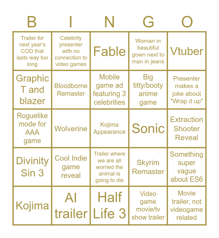 This bingo card has a free space and 25 words: Kojima, Cool Indie game reveal, Mobile game ad featuring 3 celebrities, Video game movie/tv show trailer, Presenter makes a joke about "Wrap it up", Trailer for next year's COD that lasts way too long, Celebrity presenter with no connection to video games, Fable, Big titty/booty anime game, Something super vague about ES6, Roguelike mode for AAA game, Bloodborne Remaster, Skyrim Remaster, Movie trailer, not videogame related, Graphic T and blazer, AI trailer, Half Life 3, Woman in beautiful gown next to man in jeans, Extraction Shooter Reveal, Divinity Sin 3, Wolverine, Trailer where we are all worried the animal is going to die, Sonic, Vtuber and Vtuber.