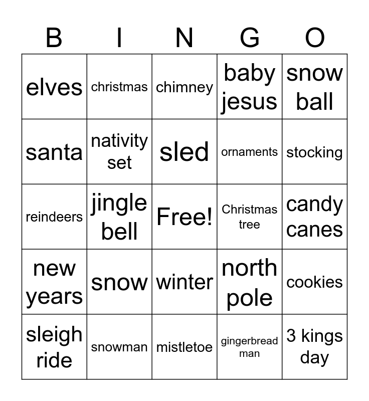 This bingo card has a free space and 24 words: snow, snowman, sled, sleigh ride, snow ball, elves, santa, christmas, Christmas tree, winter, ornaments, reindeers, north pole, cookies, nativity set, gingerbread man, candy canes, chimney, stocking, jingle bell, 3 kings day, new years, baby jesus and mistletoe.