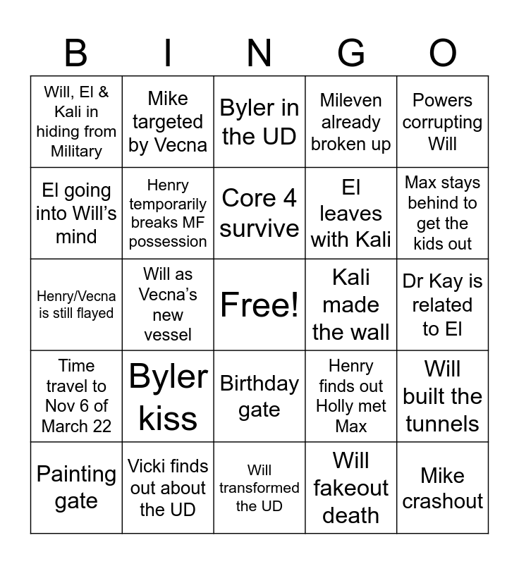 This bingo card has a free space and 24 words: Byler kiss, Vicki finds out about the UD, Core 4 survive, Painting gate, Powers corrupting Will, Will, El & Kali in hiding from Military, El going into Will’s mind, Mike targeted by Vecna, Kali made the wall, Birthday gate, El leaves with Kali, Henry/Vecna is still flayed, Henry finds out Holly met Max, Will built the tunnels, Henry temporarily breaks MF possession, Will fakeout death, Dr Kay is related to El, Byler in the UD, Max stays behind to get the kids out, Will as Vecna’s new vessel, Mike crashout, Time travel to Nov 6 of March 22, Mileven already broken up and Will transformed the UD.
