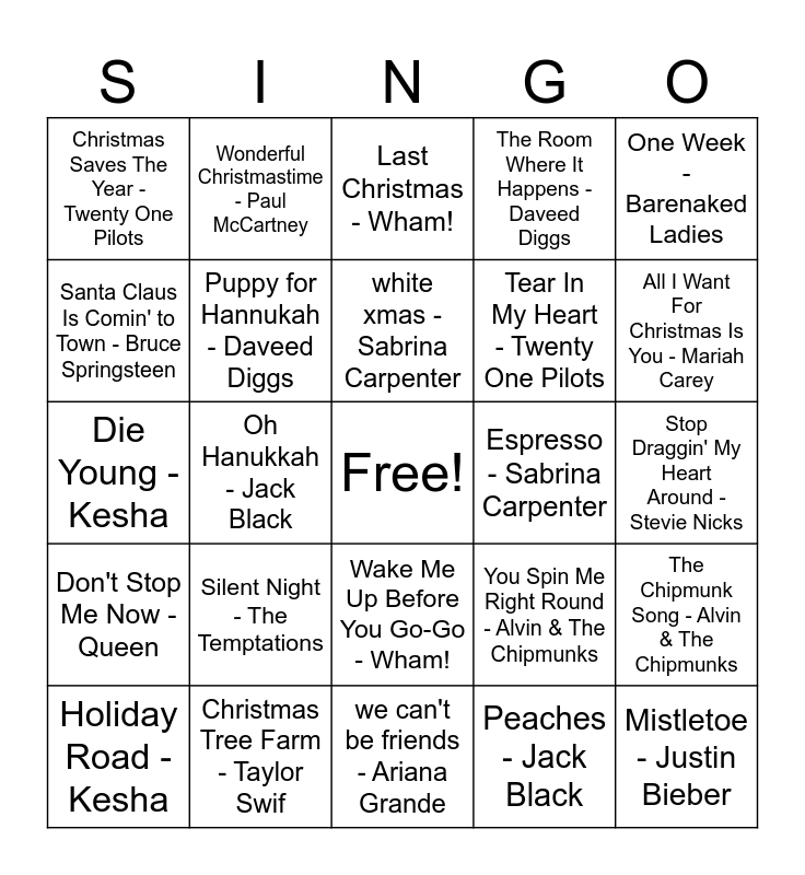 This bingo card has a free space and 50 words: Baby - Justin Bieber, Mistletoe - Justin Bieber, Santa Tell Me - Ariana Grande, we can't be friends - Ariana Grande, Silent Night - The Temptations, My Girl - The Temptations, Wonderful Christmastime - Paul McCartney, Band On The Run - Paul McCartney, Santa Claus Is Comin' to Town - Bruce Springsteen, Dancing In the Dark - Bruce Springsteen, Puppy for Hannukah - Daveed Diggs, The Room Where It Happens - Daveed Diggs, The Chipmunk Song - Alvin & The Chipmunks, You Spin Me Right Round - Alvin & The Chipmunks, Like It's Christmas - The Jonas Brothers, Sucker - The Jonas Brothers, white xmas - Sabrina Carpenter, Espresso - Sabrina Carpenter, I Have A Little Dreidel - Barenaked Ladies, One Week - Barenaked Ladies, Oh Hanukkah - Jack Black, Peaches - Jack Black, Christmas Saves The Year - Twenty One Pilots, Tear In My Heart - Twenty One Pilots, It Feels Like Christmas - Fall Out Boy, Dance, Dance - Fall Out Boy, All I Want For Christmas Is You - Mariah Carey, We Belong Together - Mariah Carey, Last Christmas - Wham!, Wake Me Up Before You Go-Go - Wham!, Happy Xmas (War Is Over) - John Lennon, Beautiful Boy (Darling Boy) - John Lennon, Feliz Navidad - José Feliciano, Por Qué Te Tengo Que Olvidar - José Feliciano, Christmas Tree Farm - Taylor Swif, Cruel Summer - Taylor Swift, Santa Drives An Astrovan - Mt. Joy, Silverlining - Mt. Joy, Silent Night - Stevie Nicks, Stop Draggin' My Heart Around - Stevie Nicks, Winter Wonderland - Laufey, From The Start - Laufey, Let It Snow! Let It Snow! Let It Snow! - Frank Sinatra, Fly Me To The Moon - Frank Sinatra, Holiday Road - Kesha, Die Young - Kesha, Need You Now - Lady A, Baby, It's Cold Outside - Lady A, Don't Stop Me Now - Queen and Thank God It's Christmas - Queen.