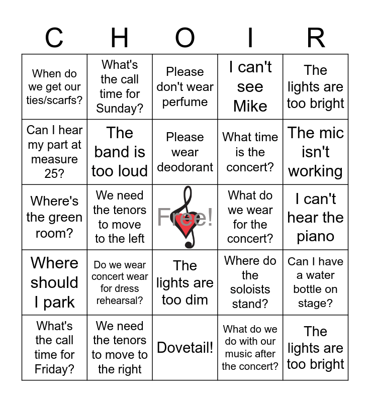 This bingo card has a free space and 24 words: Do we wear concert wear for dress rehearsal?, We need the tenors to move to the right, Please wear deodorant, What's the call time for Friday?, The lights are too bright, When do we get our ties/scarfs?, Can I hear my part at measure 25?, What's the call time for Sunday?, What do we wear for the concert?, The lights are too dim, What time is the concert?, Where's the green room?, Where do the soloists stand?, Can I have a water bottle on stage?, The band is too loud, What do we do with our music after the concert?, I can't hear the piano, Please don't wear perfume, The mic isn't working, We need the tenors to move to the left, The lights are too bright, Where should I park, I can't see Mike and Dovetail!.