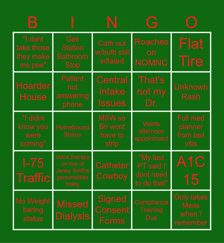This bingo card has a free space and 24 words: Voice therapy on five of Janey Smiths personalities today, Missed Dialysis, Central Intake Issues, No Weight baring status, Flat Tire, "I dont take those they make me pee", Hoarder House, Gas Station Bathroom Stop, Wants afternoon appointment, Catheter Cowboy, That's not my Dr., "I didnt know you were coming", "My last PT said I dont need to do that", A1C 15, Patient not answering phone, Compliance Training Due, Full med planner from last vitis, Cath out w/bulb still inflated, Unknown Rash, Homebound Status, Only takes Meds when I remember, I-75 Traffic, Roaches on NOMNC and Signed Consent Forms.