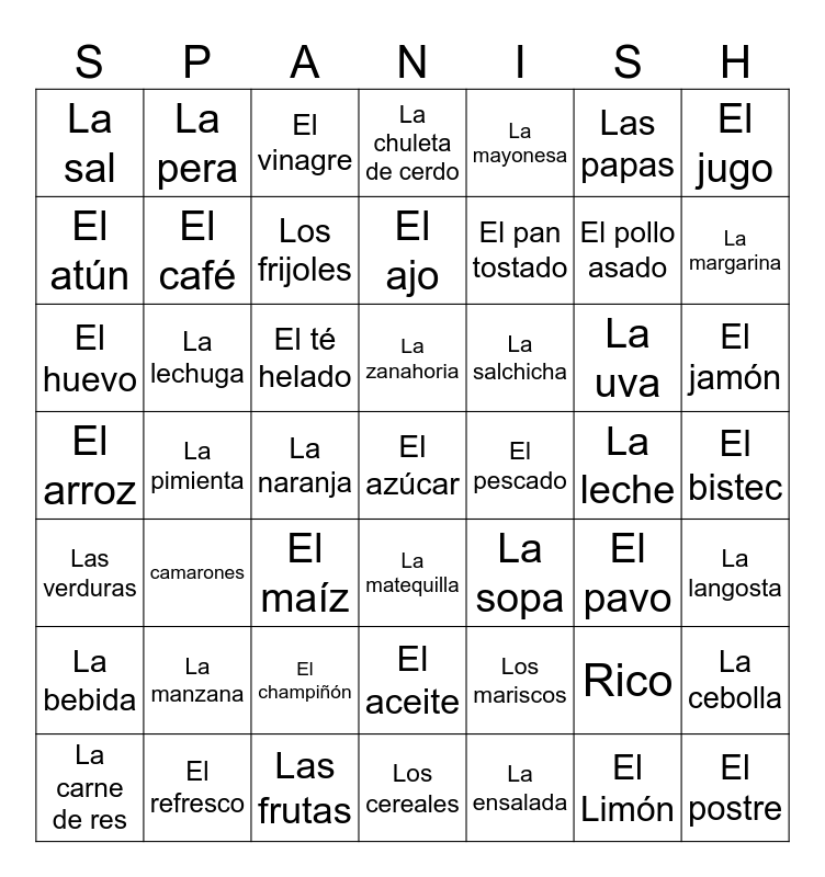 This bingo card has 49 words: Rico, El pollo asado, La ensalada, La pimienta, El té helado, El bistec, La pera, Las frutas, Las papas, La matequilla, El jugo, La chuleta de cerdo, La uva, La salchicha, La manzana, La leche, El atún, La margarina, La cebolla, La mayonesa, El pan tostado, La naranja, La sal, El café, La carne de res, Los frijoles, El jamón, El refresco, La zanahoria, La lechuga, El postre, El pescado, La bebida, El champiñón, El arroz, La sopa, El pavo, La langosta, El huevo, El maíz, El aceite, Las verduras, El azúcar, Los cereales, El ajo, El vinagre, Los mariscos, camarones and El Limón.