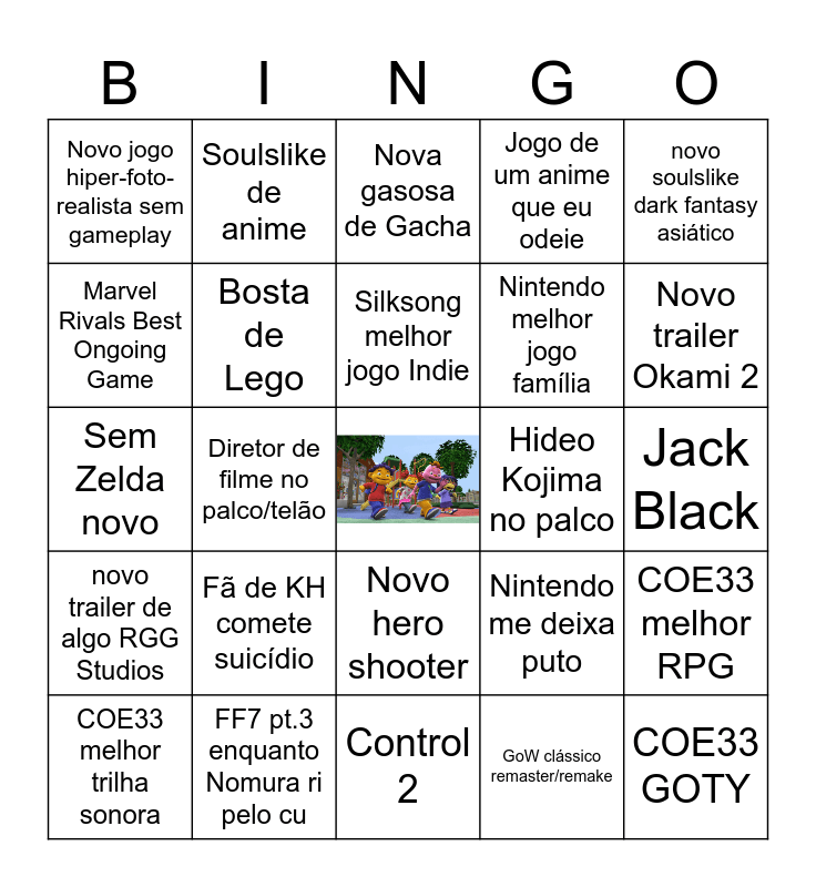 This bingo card has a free space and 24 words: Fã de KH comete suicídio, FF7 pt.3 enquanto Nomura ri pelo cu, Silksong melhor jogo Indie, COE33 melhor trilha sonora, novo soulslike dark fantasy asiático, Novo jogo hiper-foto-realista sem gameplay, Marvel Rivals Best Ongoing Game, Soulslike de anime, Hideo Kojima no palco, Novo hero shooter, Nintendo melhor jogo família, Sem Zelda novo, Nintendo me deixa puto, COE33 melhor RPG, Bosta de Lego, GoW clássico remaster/remake, Jack Black, Nova gasosa de Gacha, Fortnite, Diretor de filme no palco/telão, Fallout S02 ou Fallout 76, Trailer de algo da RGG, Jogo de um anime que eu odeie and Control 2.