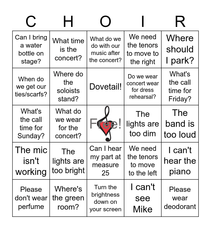 This bingo card has a free space and 24 words: The lights are too bright, Where's the green room?, Dovetail!, Please don't wear perfume, Where should I park?, Can I bring a water bottle on stage?, When do we get our ties/scarfs?, What time is the concert?, The lights are too dim, Can I hear my part at measure 25, Do we wear concert wear for dress rehearsal?, What's the call time for Sunday?, We need the tenors to move to the left, I can't hear the piano, Where do the soloists stand?, I can't see Mike, The band is too loud, What do we do with our music after the concert?, What's the call time for Friday?, What do we wear for the concert?, Please wear deodorant, The mic isn't working, We need the tenors to move to the right and Turn the brightness down on your screen.