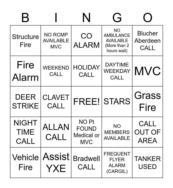 This bingo card has a free space and 24 words: ALLAN CALL, Assist YXE, HOLIDAY CALL, Vehicle Fire, Blucher Aberdeen CALL, Structure Fire, Fire Alarm, NO RCMP AVAILABLE MVC, STARS, NO Pt FOUND Medical or MVC, DAYTIME WEEKDAY CALL, DEER STRIKE, NO MEMBERS AVAILABLE, CALL OUT OF AREA, WEEKEND CALL, FREQUENT FLYER ALARM (CARGIL), Grass Fire, CO ALARM, MVC, CLAVET CALL, TANKER USED, NIGHT TIME CALL, NO AMBULANCE AVAILABLE (More than 2 hours wait) and Bradwell CALL.