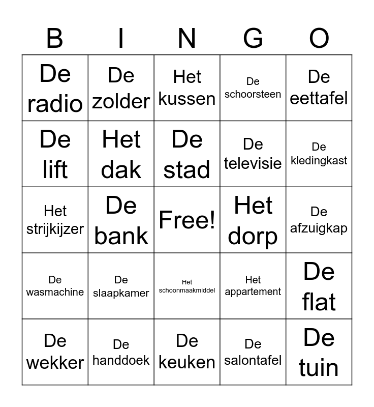 This bingo card has a free space and 51 words: Het huis, De tuin, De woonkamer, De keuken, De slaapkamer, De badkamer, De zolder, De trap, De lift, De garage, Het dak, De schoorsteen, De flat, Het appartement, De verdieping, De boerderij, De stad, Het dorp, Het vloerkleed, De eettafel, De bank, De salontafel, De radio, De televisie, Het gordijn, Het bed, De kledingkast, De spiegel, De wekker, Het kussen, De deken, Het laken, De wastafel, Het bad, De douche, De handdoek, De zeep, Het fornuis, De magnetron, De koelkast, De afzuigkap, De wasmachine, De afwasmachine, de vaatwasser, De stofzuiger, De strijkplank, Het strijkijzer, De bezem, De emmer, Het schoonmaakmiddel and De gootsteen.