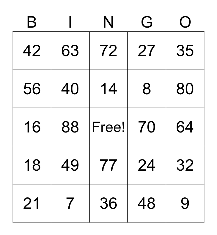 This bingo card has a free space and 24 words: 49, 7, 14, 21, 35, 42, 56, 63, 70, 77, 8, 16, 24, 32, 40, 48, 64, 72, 80, 88, 9, 18, 27 and 36.