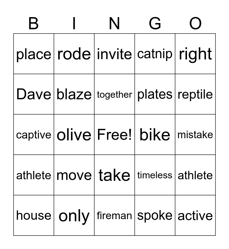 This bingo card has a free space and 24 words: move, only, together, house, right, place, Dave, rode, bike, take, plates, captive, timeless, athlete, blaze, spoke, mistake, invite, reptile, olive, active, athlete, catnip and fireman.