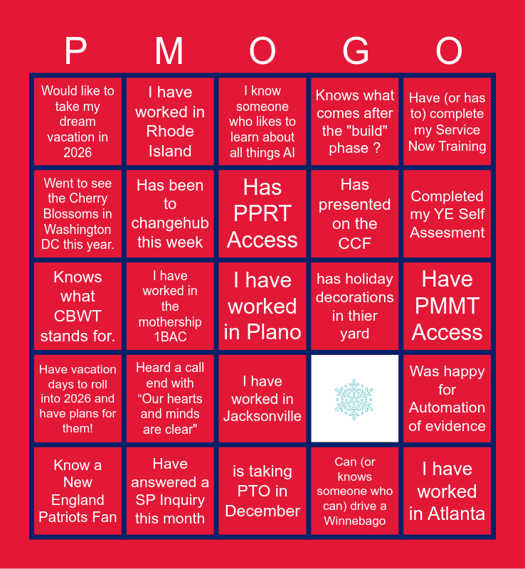 This bingo card has 1 images and 24 words: Heard a call end with “Our hearts and minds are clear", is taking PTO in December, Has PPRT Access, Know a New England Patriots Fan, Have (or has to) complete my Service Now Training, Would like to take my dream vacation in 2026, Went to see the Cherry Blossoms in Washington DC this year., I have worked in Rhode Island, has holiday decorations in thier yard, I have worked in Jacksonville, Has presented on the CCF, Knows what CBWT stands for., Was happy for Automation of evidence, Has been to changehub this week, I have worked in Atlanta, Have PMMT Access, I know someone who likes to learn about all things AI, Completed my YE Self Assesment, I have worked in the mothership 1BAC, I have worked in Plano, Have answered a SP Inquiry this month, Have vacation days to roll into 2026 and have plans for them!, Knows what comes after the "build" phase ? and Can (or knows someone who can) drive a Winnebago.