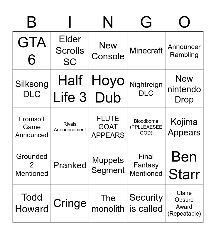 This bingo card has a free space and 26 words: Muppets Segment, Security is called, Hoyo Dub, Cringe, Announcer Rambling, GTA 6, Silksong DLC, Elder Scrolls SC, Kojima Appears, Final Fantasy Mentioned, Nightreign DLC, Fromsoft Game Announced, Ben Starr, Todd Howard, Rivals Announcement, Overwatch mentioned, Minecraft, Grounded 2 Mentioned, New Console, Claire Obsure Award (Repeatable), New nintendo Drop, The monolith, Bloodborne (PPLLEAESEE GOD), Pranked, Half Life 3 and Scuffed Presentation.
