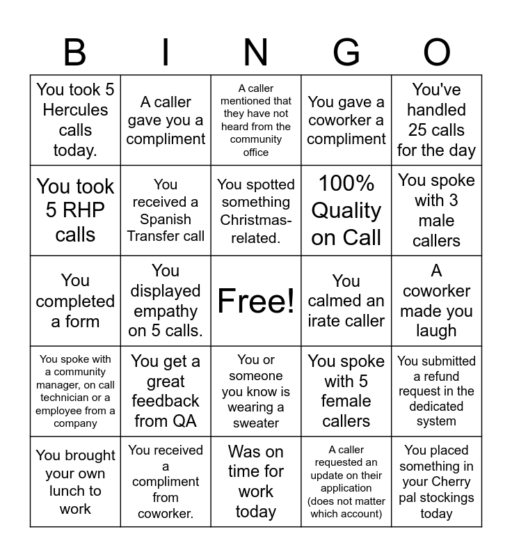 This bingo card has a free space and 24 words: You get a great feedback from QA, You received a compliment from coworker., You spotted something Christmas-related., You brought your own lunch to work, You've handled 25 calls for the day, You took 5 Hercules calls today., You took 5 RHP calls, A caller gave you a compliment, You calmed an irate caller, You or someone you know is wearing a sweater, 100% Quality on Call, You completed a form, You spoke with 5 female callers, You submitted a refund request in the dedicated system, You received a Spanish Transfer call, A caller requested an update on their application (does not matter which account), A coworker made you laugh, A caller mentioned that they have not heard from the community office, You spoke with 3 male callers, You displayed empathy on 5 calls., You placed something in your Cherry pal stockings today, You spoke with a community manager, on call technician or a employee from a company, You gave a coworker a compliment and Was on time for work today.